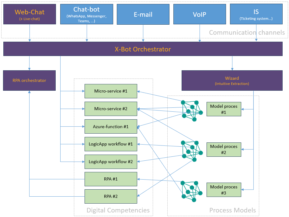X-Bot predstavuje pokročilú hyper-automation platformu, ktorá prepája dáta, znalosti, procesy, systémy a zariadenia do jednotného riadiaceho a rozhodovacieho ekosystému. Je určený typicky pre organizácie, ktoré prekročili limity štandardných SaaS nástrojov a potrebujú plnú kontrolu nad automatizáciou, integráciami a využitím umelej inteligencie, alebo organizácie, ktoré sa digitalizácií doteraz vyhýbali a potrebujú to urobiť poriadne, aby nevyhadzovali zbytočne peniaze.